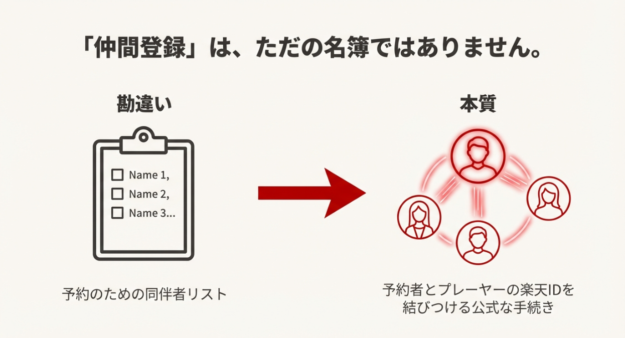 私たちが検索している「楽天ゴルフ 同伴者 登録」は、楽天GORAのシステム内では「ゴルフ仲間連携」という独自のサービス機能を指しています。 この機能は、単なる氏名登録ではなく、楽天IDを持つ予約者とプレー同伴者が、システム上で互いの会員情報を紐づけるためのプロセスなんです。 この連携を適切に行うことが、楽天GORAの提供する各種特典を最大限に活用するためのスタート地点になります。