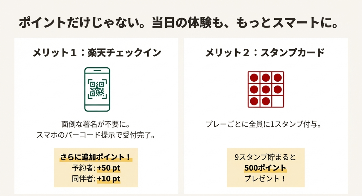 - 連携を前提とする便利な機能である「楽天チェックイン」が利用できません。 受付で手書き記入の手間を省略できず、スタート前の時間が非効率になる可能性があります。