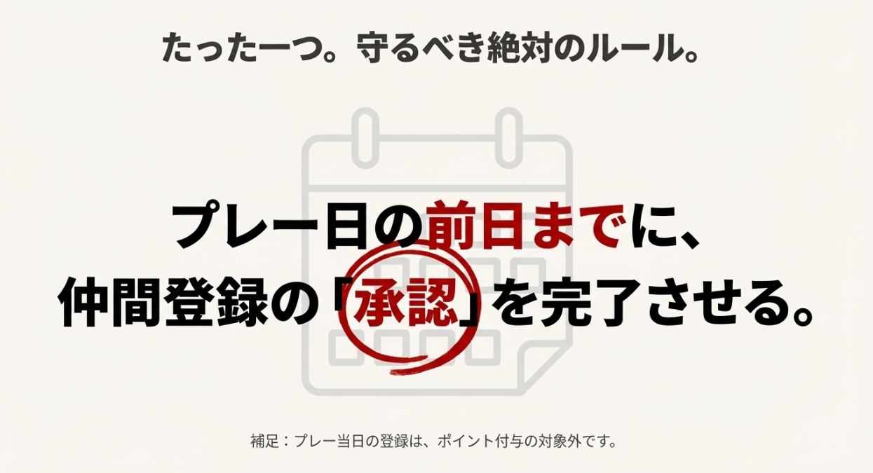 ポイント付与を受けるための絶対的な条件は、予約者が同伴者登録を完了させ、かつ同伴者側が「ゴルフ仲間として承認されている」状態が、プレー日の前日までに完了していることです。 例えば、土曜日にプレーがあるなら、金曜日の23時59分までに承認を終える必要がある、ということですね。