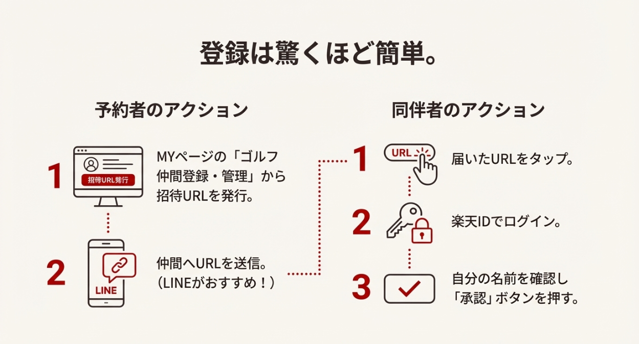 予約者が招待URLを発行し、同伴者がそのURLからアクセスして承認する、という「予約者による招待」と「同伴者による承認」という相互の操作が必要になる点が、このサービスの一番重要な特徴かなと思います。 この二段階プロセスを経ることで、システムは「このプレーヤーは確かにこの予約に参加し、楽天会員である」と認識するわけですね。