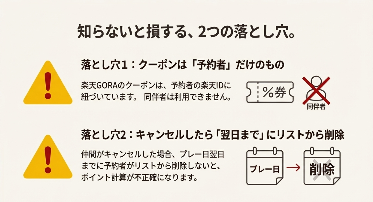 この措置は、プレーしなかったメンバーへのポイント付与を無効化し、ポイントを予約者に集約させることで、公平性を保ちつつ、ポイントが宙に浮くのを防ぐ仕組みです。 しかし、予約者としてはこの手続きをミスなく行う義務があります。