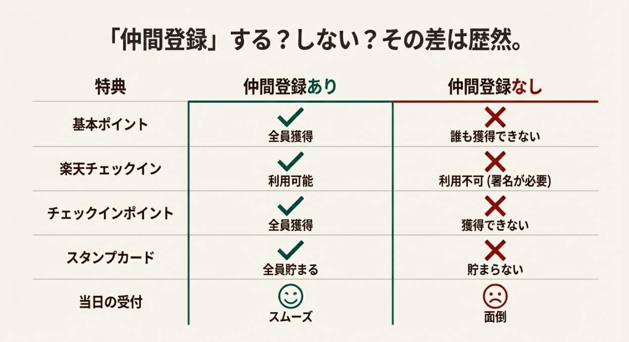 - 事前取得の推奨:ポイントを獲りたい同伴者には、連携前に楽天IDの新規登録を強く促す。 非会員では特典を何も享受できません。