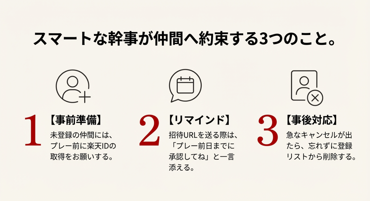 同伴者の中には、「楽天IDを持っていない」「パスワードを忘れた」という人もいるかもしれません。 招待URLを送る前に、IDの有無とログイン状態を事前に確認しておくと、承認がスムーズに進みますよ。 特に初めて一緒にプレーするメンバーには、ID取得を促すことも重要です。