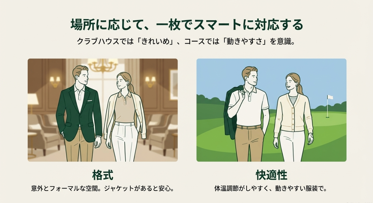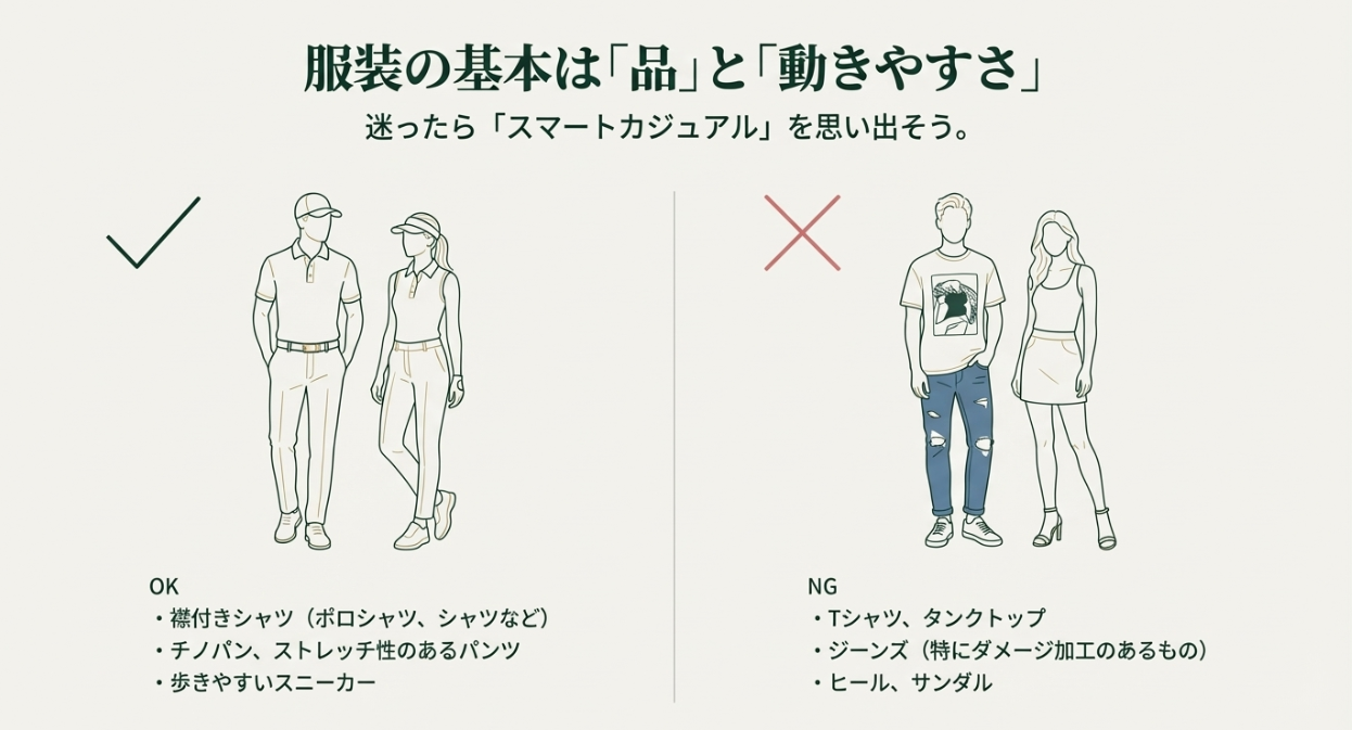 まずは「これを押さえれば大外ししない」基本からいきます。 ゴルフ場は場所によって雰囲気もルールも違うので、共通する考え方を持っておくのがいちばん強いです。 迷ったら、清潔感・動きやすさ・控えめの3つで組み立てるのが正解かなと思います。