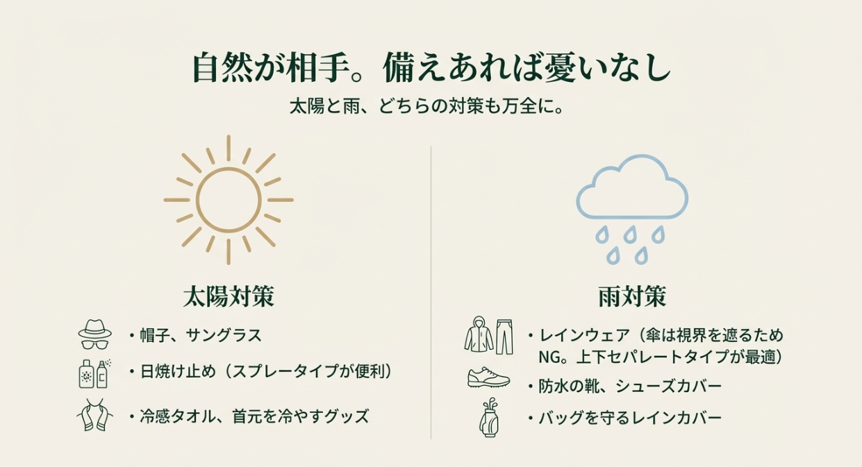 晴れの日は、熱中症と日焼けのダブル対策が必須です。 ゴルフ場は遮るものが少ないので、体感的に日差しが刺さります。 日焼けは見た目だけじゃなく、体力を持っていかれるので侮れません。 ここ、軽く見てると本当に後半きつくなるんですよね。
