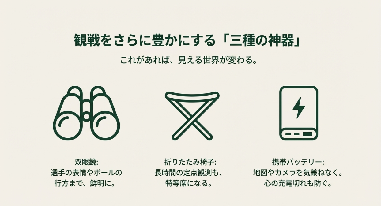 服装が整ったら、次は持ち物です。 観戦は現地の環境に左右されるので、装備の差がそのまま快適さの差になります。 ここでは「持っていってよかった」と感じやすいものを、優先度高めでまとめます。