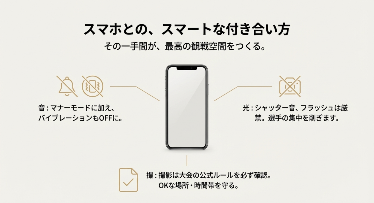 撮影やSNS投稿の細かい条件は大会ごとに違います。 正確な情報は大会公式サイトや会場の案内を必ず確認してください。 撮影OKと書いてあっても、エリア・時間・機材・姿勢などの条件が付くことがあります。