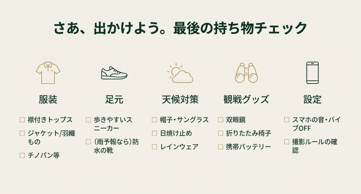 「結局、何を持っていけばいいの?」となりやすいので、最後にチェックリストを置いておきます。 あなたの観戦スタイルに合わせて、必要なものだけ選べばOKです。