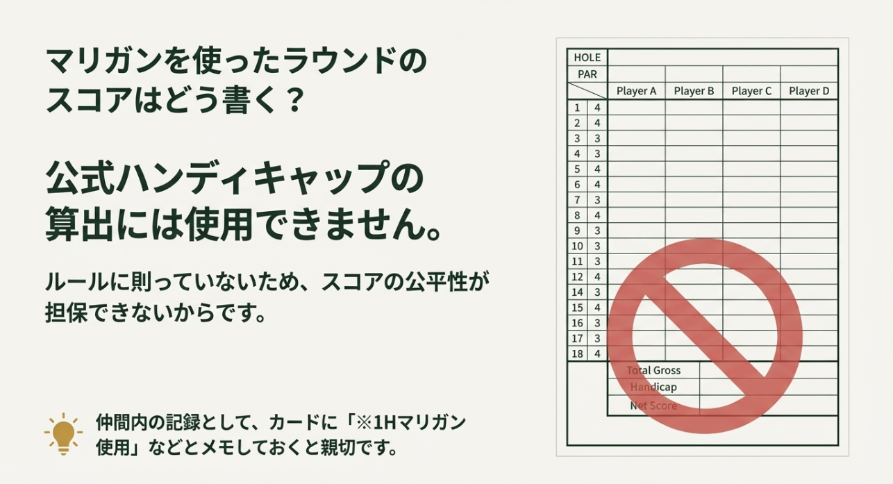 スコアカードについても、マリガンを使ったラウンドは「公式スコアとしては扱わない」意識が大事です。 エンジョイで使ったなら、カードの端にメモしておく程度にして、ベストスコア更新みたいに扱わない方が後で自分がラクです。 私の場合は、メモするなら「1Hマリガン使用」くらいの短いメモにします。 あとで見返したときに、納得感が残るんですよね。