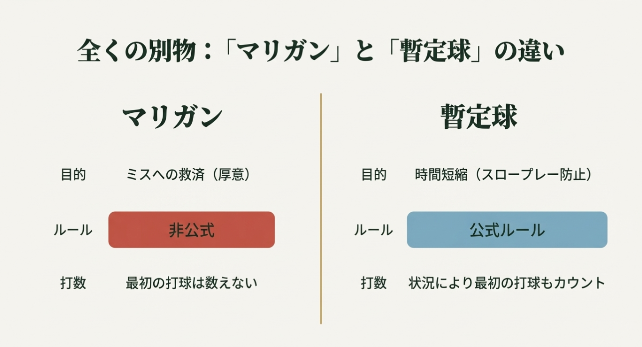 マリガンは「1球目を無かったこと」にします。 暫定球は「1球目がダメだったときの保険」で、1球目が無事なら、暫定球は使いません。 この違いが分かると、現場で迷いにくくなります。