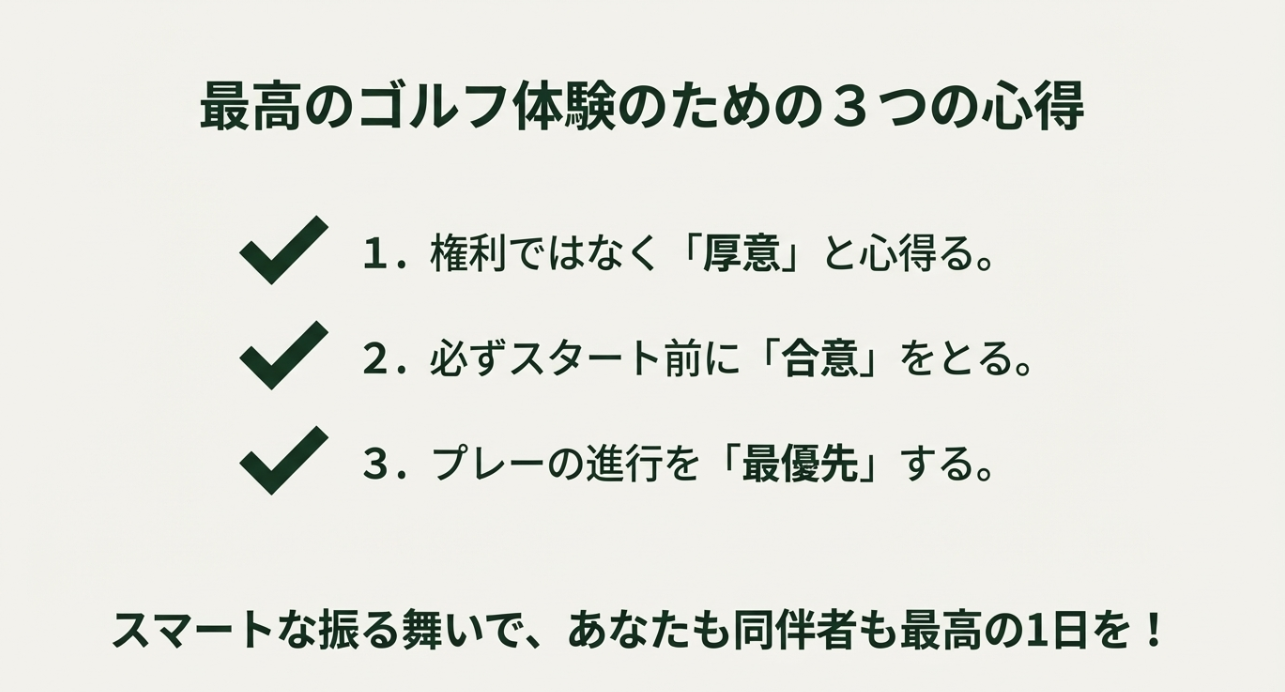 最後にもう一度。 最終的なルール判断は、当日のローカルルール掲示や公式サイトをご確認ください。 状況によって解釈が分かれる場合は、ゴルフ場スタッフや競技委員など専門家に相談するのが安心です。 あなたが気持ちよく回れて、同伴者も気持ちよく帰れる。 それがいちばんいいラウンドですよ。