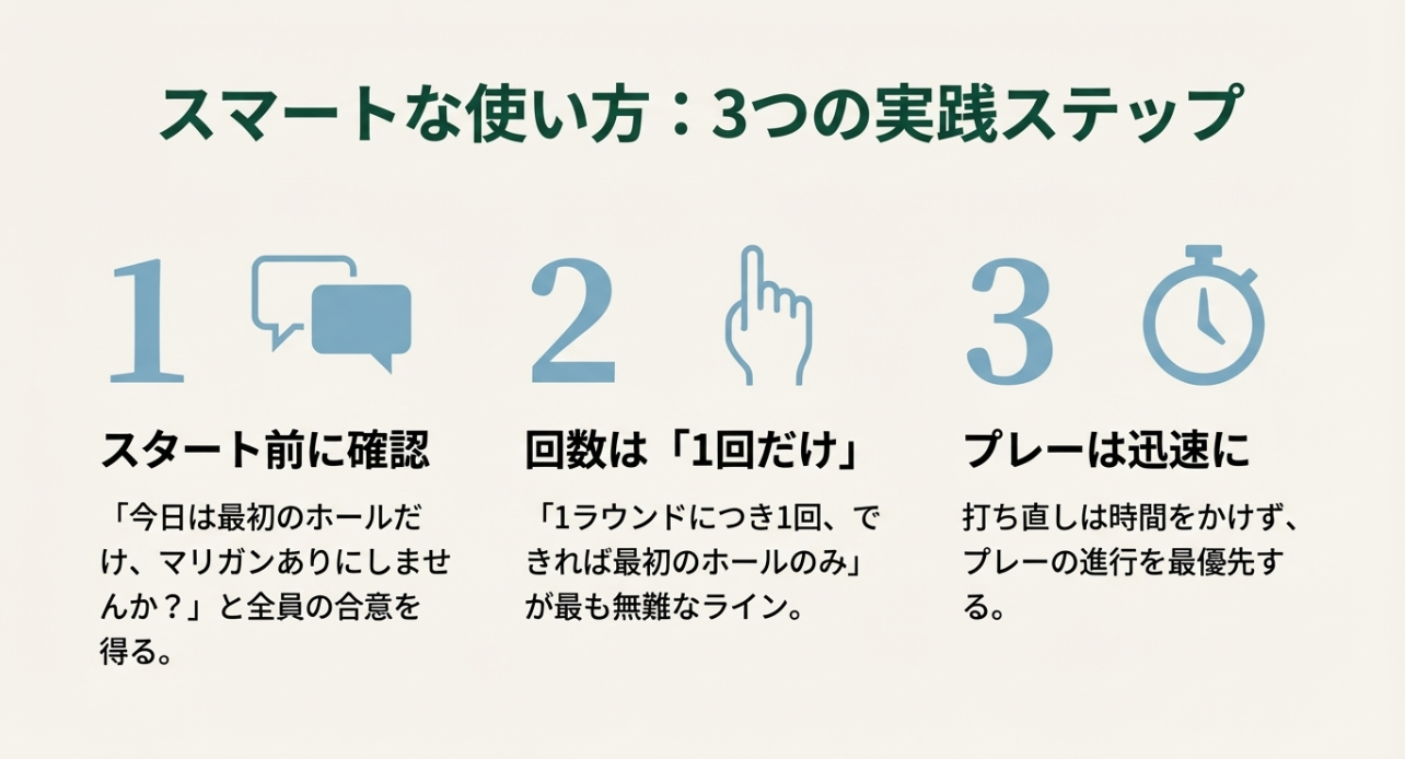 マリガンを一番スマートに使うコツは、事前合意と即宣言です。 スタート前に「今日はマリガンありでいきます?」って軽く確認しておくと、当日の空気がめちゃくちゃラクになります。 ここ、気になりますよね。言い出しにくい人もいるんですが、最初に確認しておく方が、結局みんな助かることが多いです。
