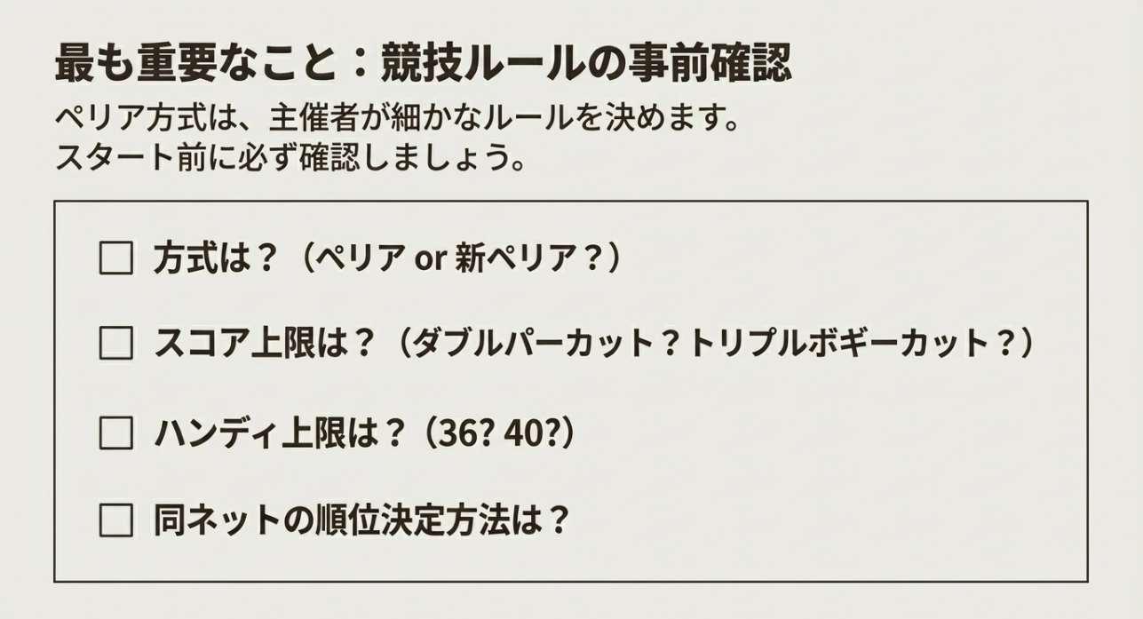 そして一番大事なのは、方式名よりも「今回のコンペの条件」です。 ハンディ上限があるのか、打数制限があるのか、端数処理はどうか、同ネットはどう裁くのか。 ここが揃っていると、ペリアは本当に運営がラクになります。 逆に言えば、ここが曖昧だと、ペリアの面白さより「揉める要素」が前に出ちゃいます。