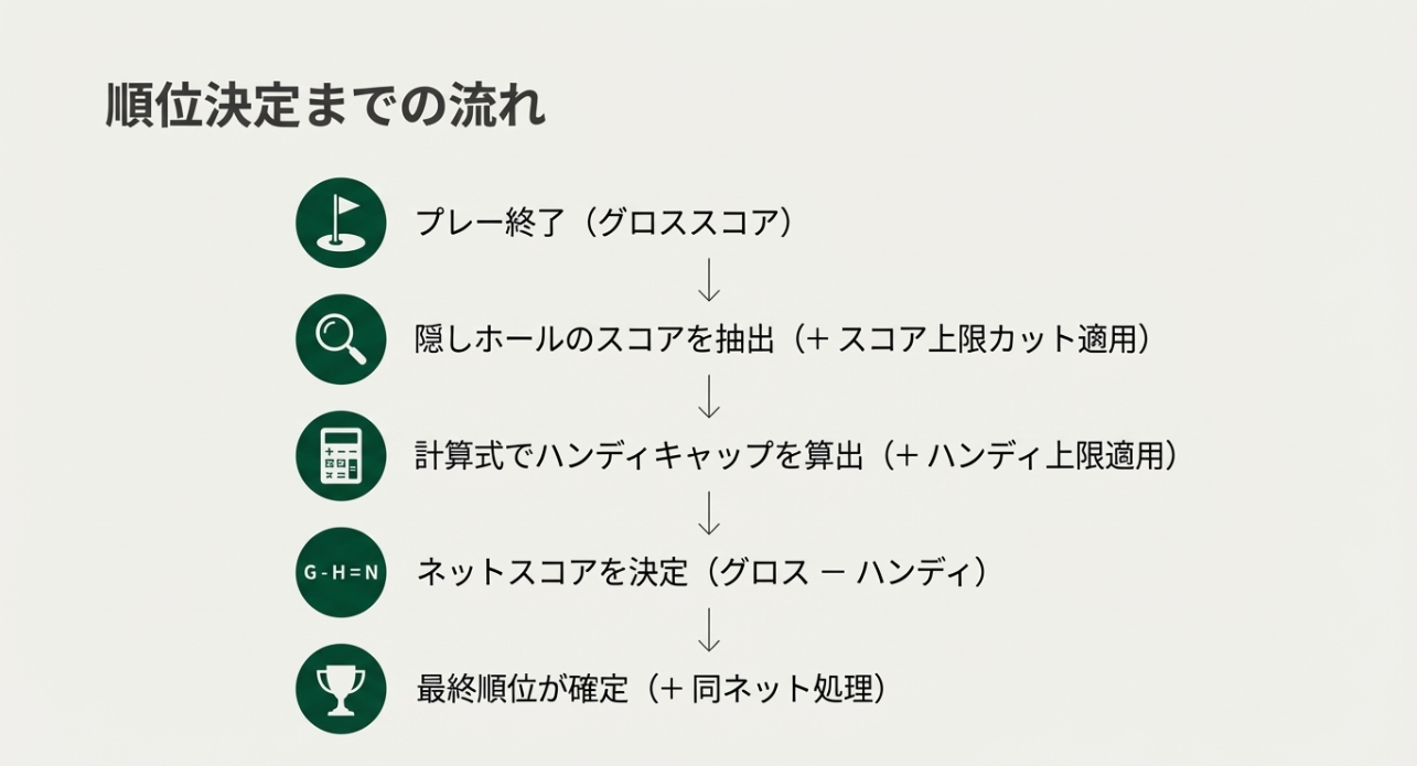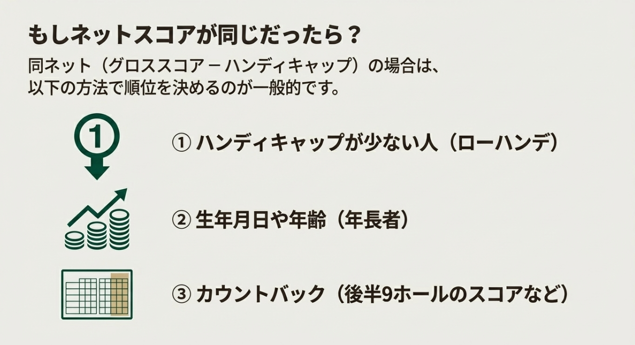 ネットスコアが同じになったときの順位決めは、意外とトラブルの元です。 ここ、地味に大事ですよ。 なぜなら、上位が拮抗すると「同ネット」が普通に起きるからです。 事前に決めておくのが一番安全です。