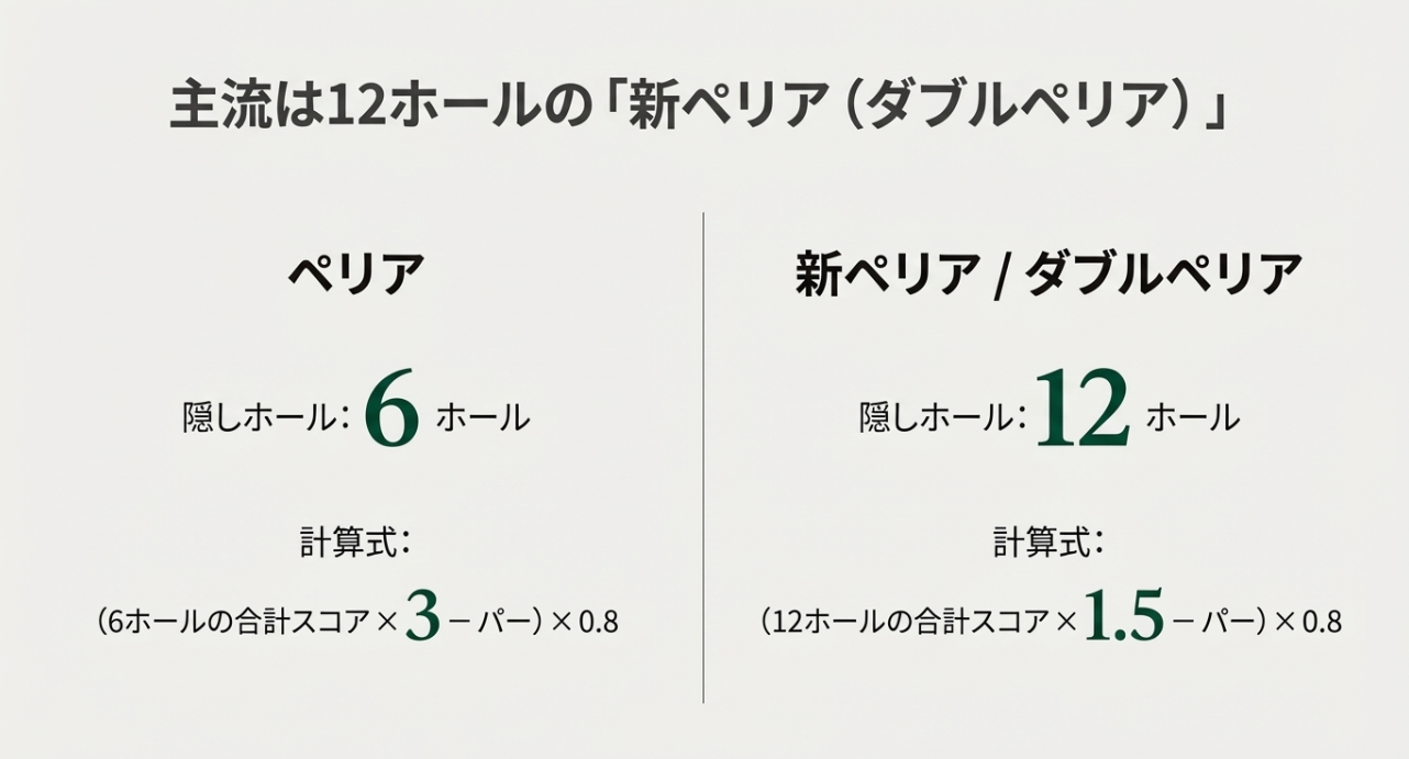 | 新ペリア(ダブルペリア) | 12ホール | ×1.5 | 低め | 一般的な企業コンペ |