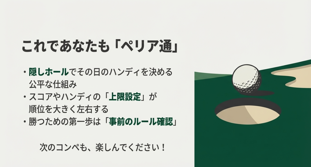 最後に、ゴルフのペリアとは何かを一言でまとめると、当日のスコアからハンディキャップを作り、ネットスコアで順位をつけるコンペ向けの仕組みです。 ここまで読んだあなたなら、もう表彰式で「ペリアです」と言われても慌てないはずです。