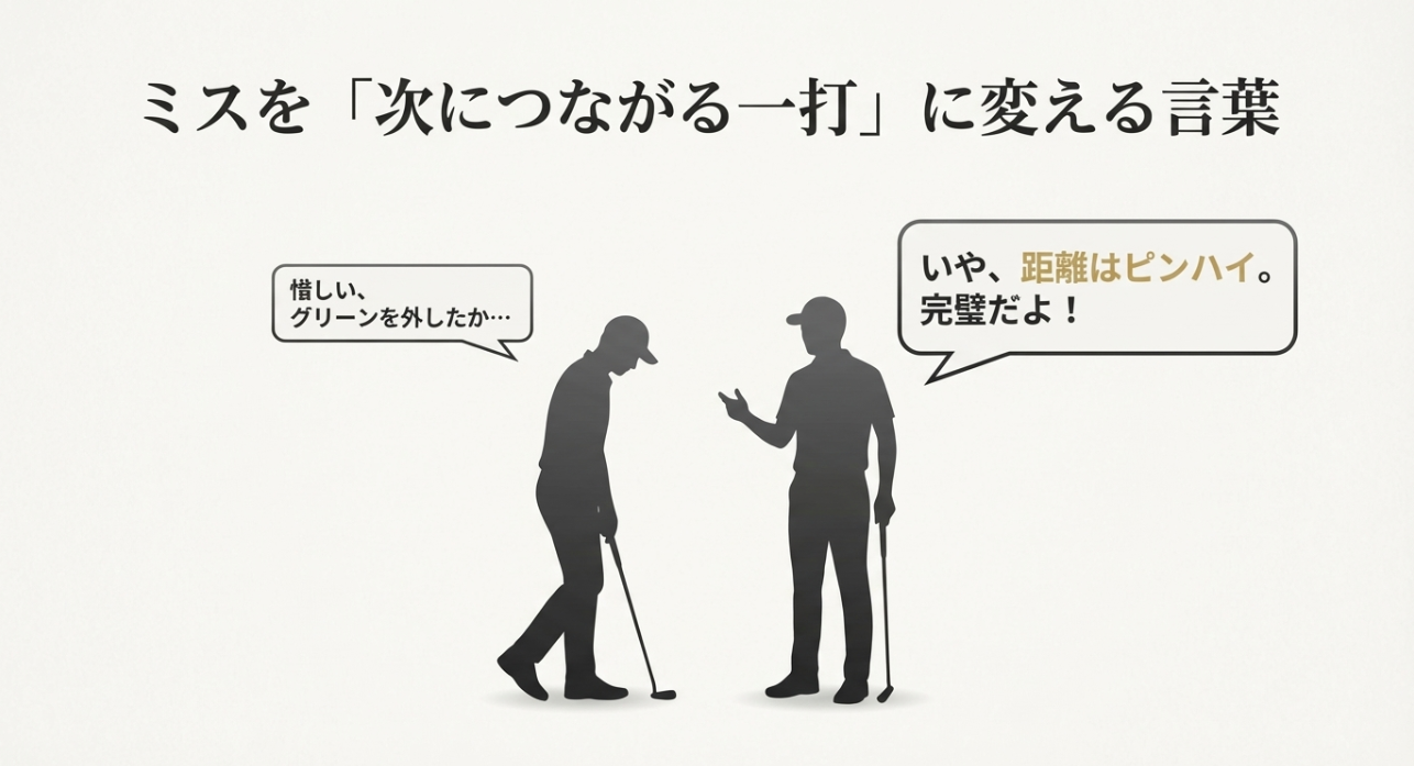 この一言の良さは、「結果(ピンに寄った/寄らない)」じゃなくて「プロセス(距離感)」を褒められる点です。 ゴルフって結果が運に左右される場面もあるので、プロセスを褒めるほうが相手の自信につながりやすいです。