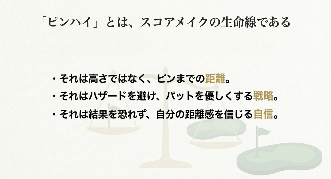 もちろんグリーン形状やピン位置で例外はありますが、まずはこの「縦と横を分ける」整理ができるだけで、ピンハイという言葉の価値が一気に上がりますよ。