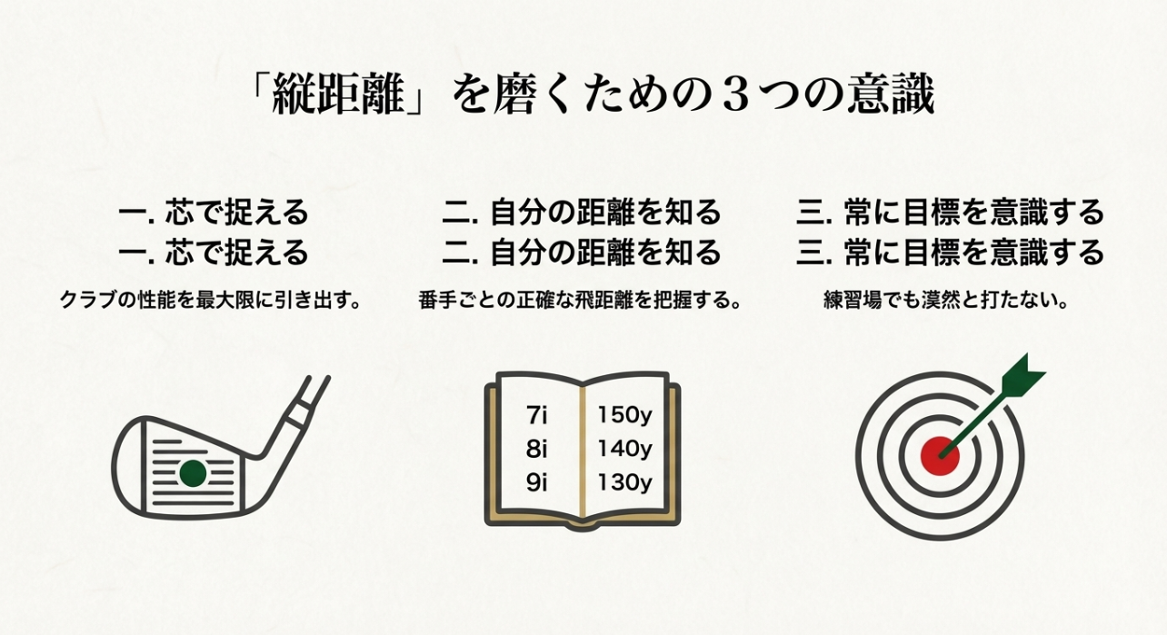 縦を揃える意識は、上達の近道になりやすいです。 まずは練習で「同じ番手で同じ距離」を作るところから始めてみてください。
