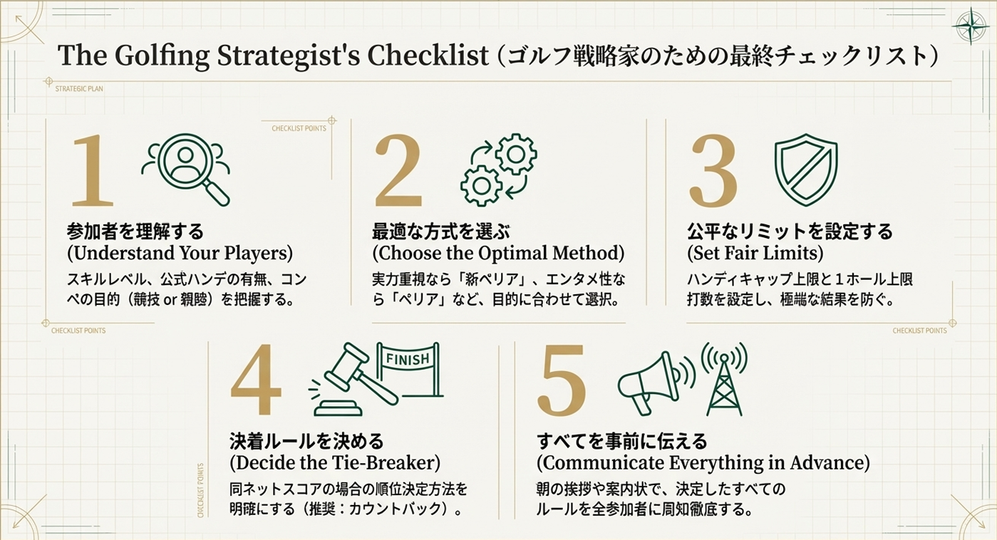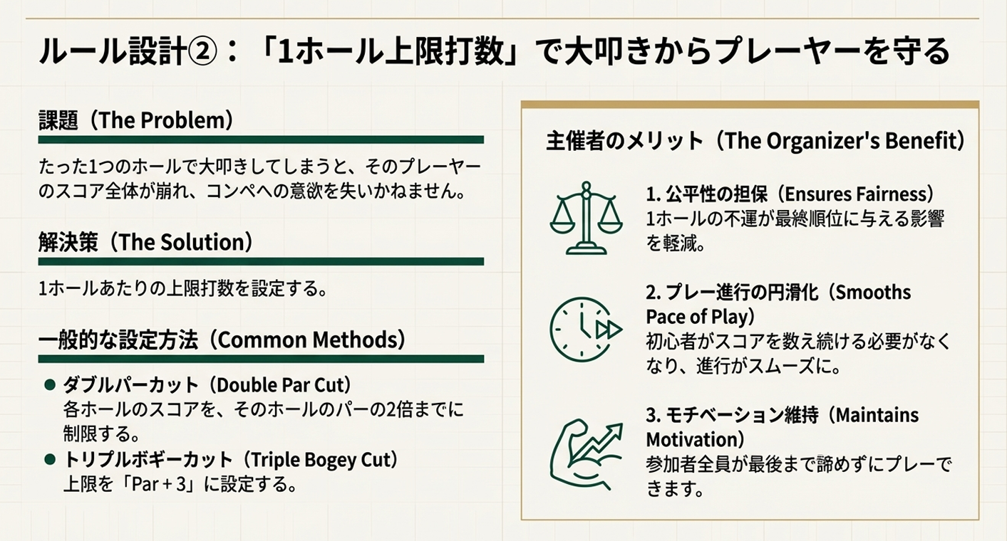 コンペは「楽しさ」と「公平さ」のバランスが大事です。 私は、メンバーの腕前が幅広いほど、上限設定や打数制限も含めてルールをセットで決めるのがベストだと思います。