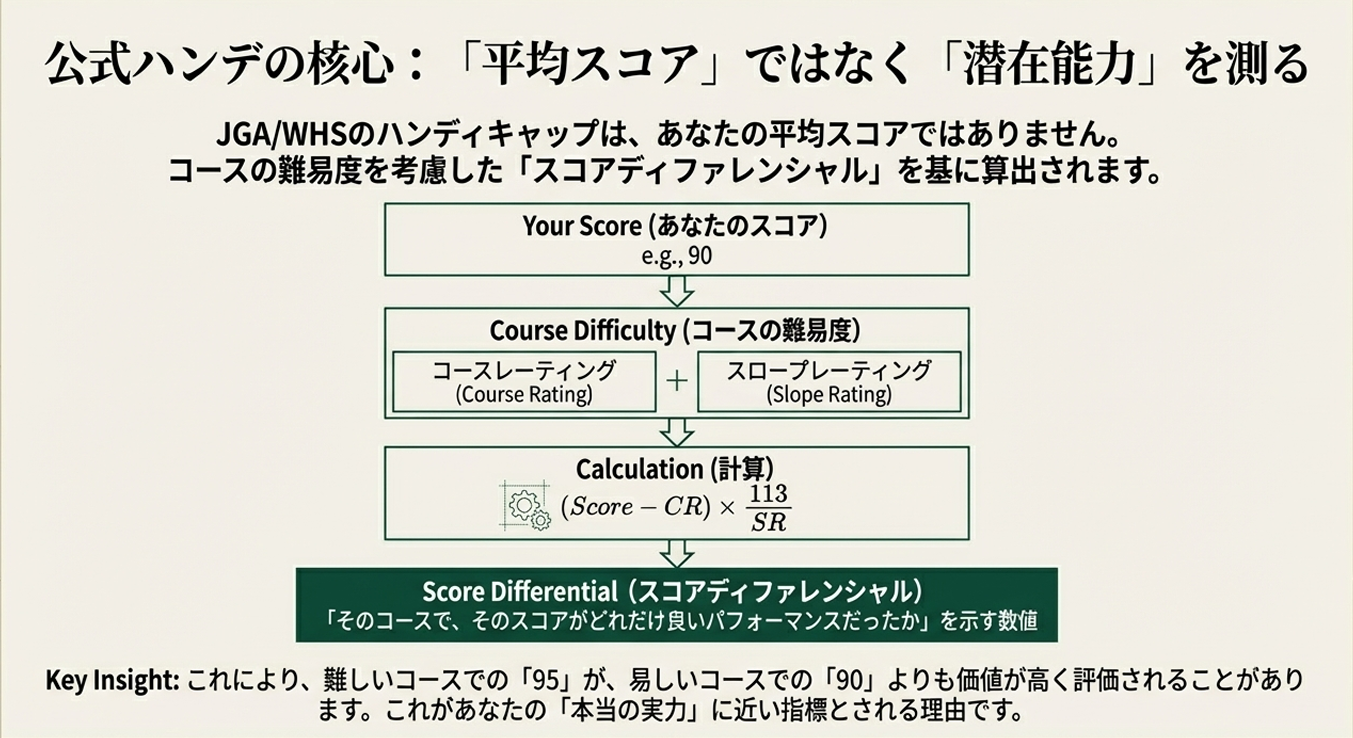 公式は、世界的に統一された考え方(WHS)に沿って管理される数値で、あなたの「潜在的な実力」を示す指標として機能します。 ゴルフ場や団体の仕組みの中で運用され、スコア提出のルールや、コースの難易度(レーティング)が前提にあります。 だから、同じ“90”でも、難しいコースで出した90と易しいコースで出した90を、一定の考え方で調整して扱えるんです。