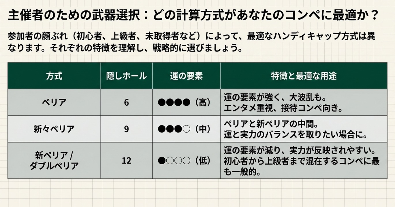 ペリア方式は隠しホールが6ホールと少ないため、当たり外れの影響が強くなります。 初心者が多い親睦コンペでは盛り上がりますが、競技性を求めると「運ゲー感」が出やすいです。 逆に言えば、番狂わせを起こしたい、上位常連をたまには崩したい、という空気ならペリアはアリです。