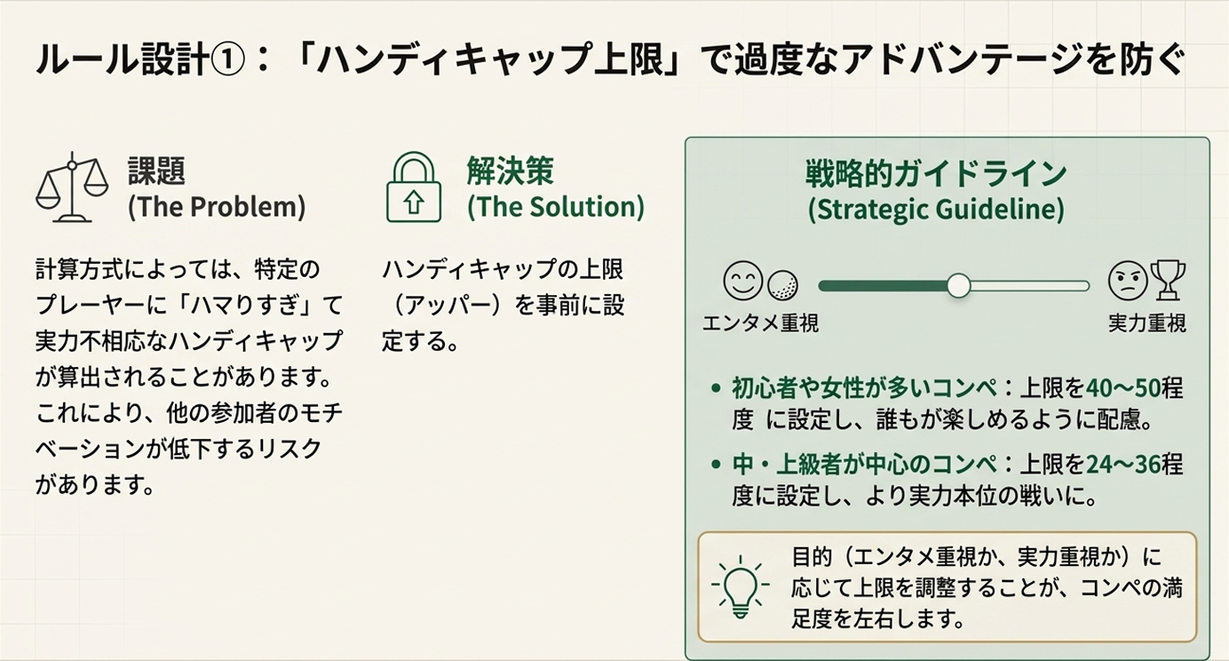 略式ハンディキャップでよく起きるのが、極端なハンデが出てしまって順位が崩れる問題です。 これを抑えるのがハンディキャップ上限で、たとえば上限を「36」「40」などに設定することが多いです(あくまで一般的な目安です)。