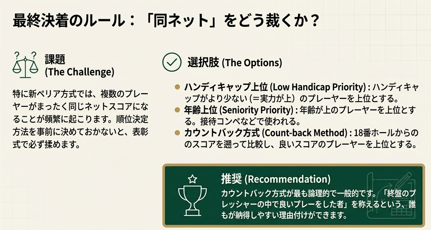 私の感覚だと、競技性を残すなら「後半比較(マッチング)」が納得されやすいです。 理由はシンプルで、「最後まで崩れずにまとめた人」を評価できるからです。 逆に親睦メインなら、シンプルなルールのほうが当日の運営が楽です。 ハンディ優先もわかりやすいですが、上位者が固定化しやすい面があるので、コンペの目的と空気感で選ぶのが良いかなと思います。