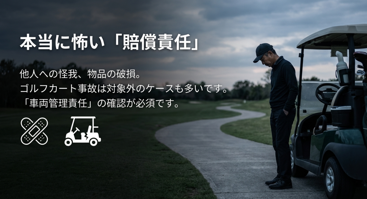 ただ、ゴルフは“日常”に見えて、実は特殊な事故形態が多いです。 代表がゴルフカートの事故。 セルフプレーが増えて、あなた自身が運転したり、同伴者が運転したりしますよね。 カート同士の接触、カーブでの転落、同乗者の落下、施設への接触。 こういう事故は「ゴルフ中の賠償」ではあるんですが、個人賠償責任の約款では、カートの所有・使用・管理に起因する事故が免責になっている場合があるんです。