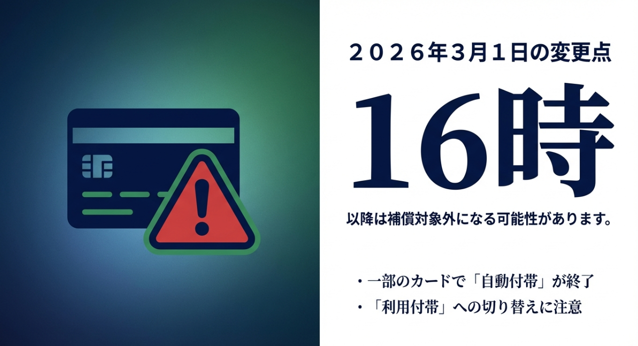 まずは結論パートです。 ここは「読む順番」を間違えると、情報が多すぎて混乱しがちなんですよ。 なので最初に、2026年の変更点と、勘違いしやすい補償の穴だけを先に押さえます。 あなたが今やるべきことは「自分のカードがどの枠組みか」を切り分けること、そのうえで切り替えの準備を前倒しすること。 この2つが芯になります。