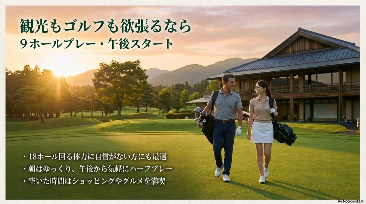 ホテル隣接の9ホールは、移動も少なくてラク。 朝食後に軽く回って、そのままアウトレットや街歩きに流れる動線が作れます。 軽井沢ゴルフハーフのノリで、旅のアクティビティとして組むのが相性いいです。