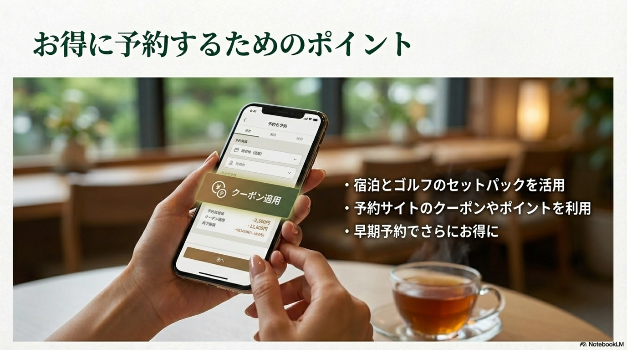 じゃらんを使う最大の価値は、宿とゴルフをまとめるだけじゃなく、クーポンとポイントで“実質価格”を落とせるところです。 ここでは、見落としがちな費用やキャンセルリスクも含めて、失敗しにくい予約の組み方をまとめます。