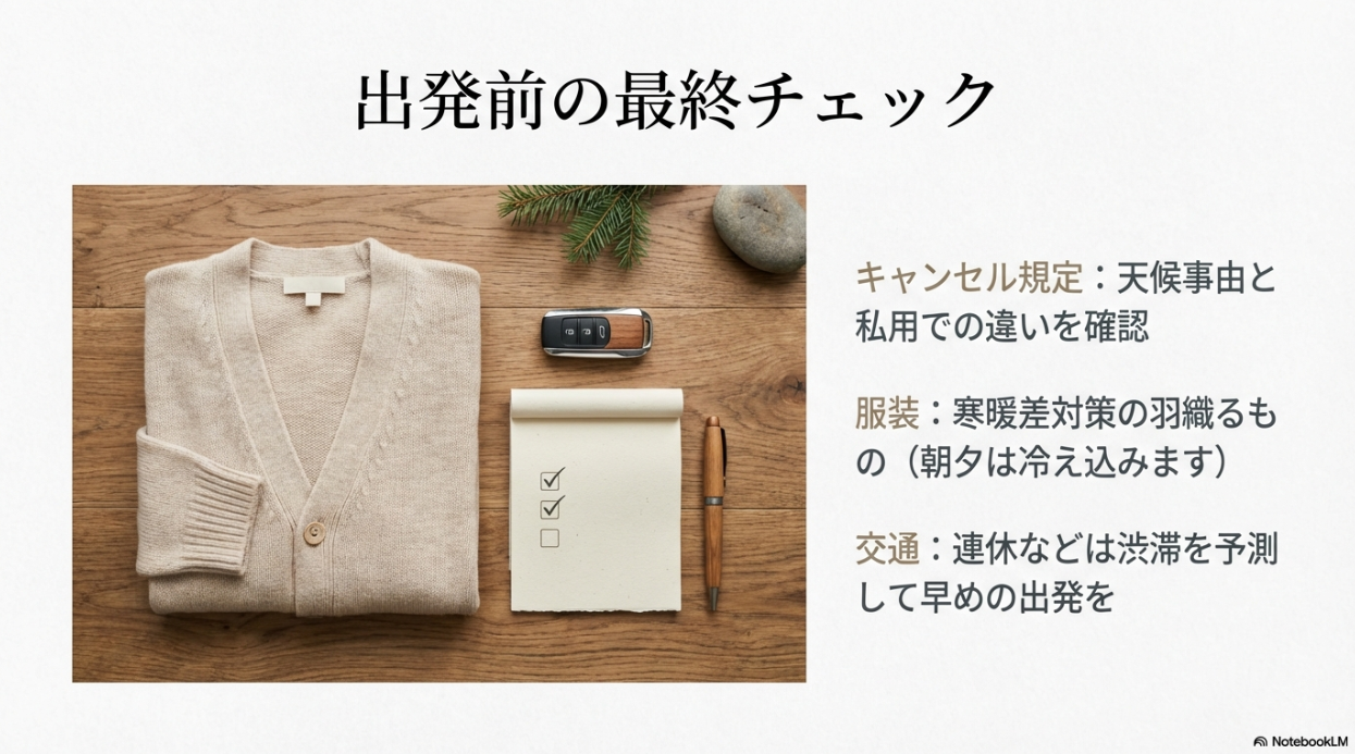 私は、天気が怪しいときほど「チェックインを早める」「翌日午前にずらせるか検討する」「スタートを早めにする」など、選択肢が残る動きをします。 もちろんこれはプランの条件次第ですが、“当日判断しかない状態”を作らないだけで、ストレスが減ります。