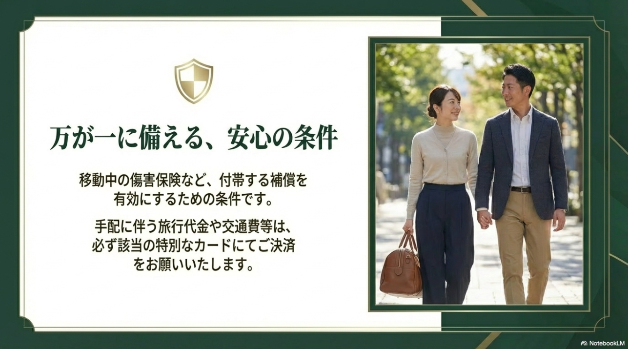 | 適用条件 | 利用付帯か自動付帯か、事前決済条件があるか |