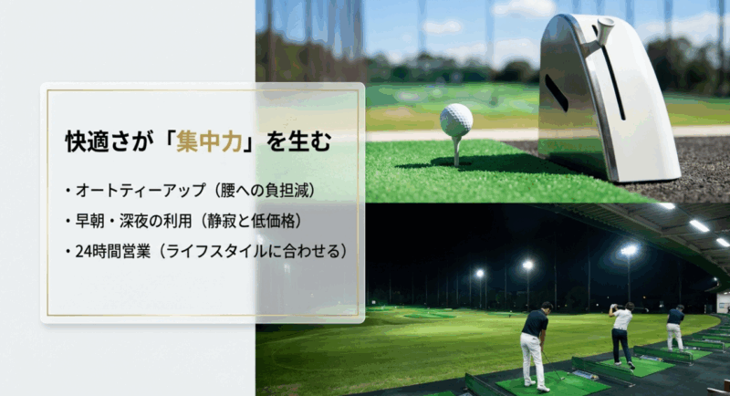 早朝は身体が硬い人が多いので、いきなりフルスイングはおすすめしません。 ストレッチ→ウェッジ→アイアン→最後にドライバー、みたいに段階を踏むと怪我予防になります。 深夜は逆に、仕事終わりで疲れていることが多いので、球数を追うより「10球でテーマを達成する」みたいな短期集中が向きます。
