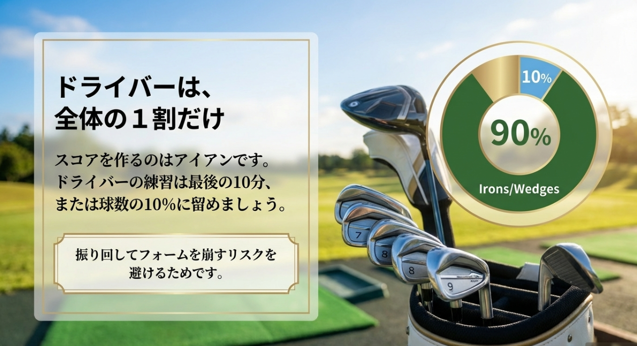 理由は簡単で、ショートゲームは疲労の影響が出にくく、フォームを整えるのに向いています。 その状態でフルショットに入ると、手打ちになりにくい。 最後にドライバーを少数にすると、集中力が保ちやすいです。 「最後に100球ドライバー」は、気持ちは分かるけど危険率高めです。