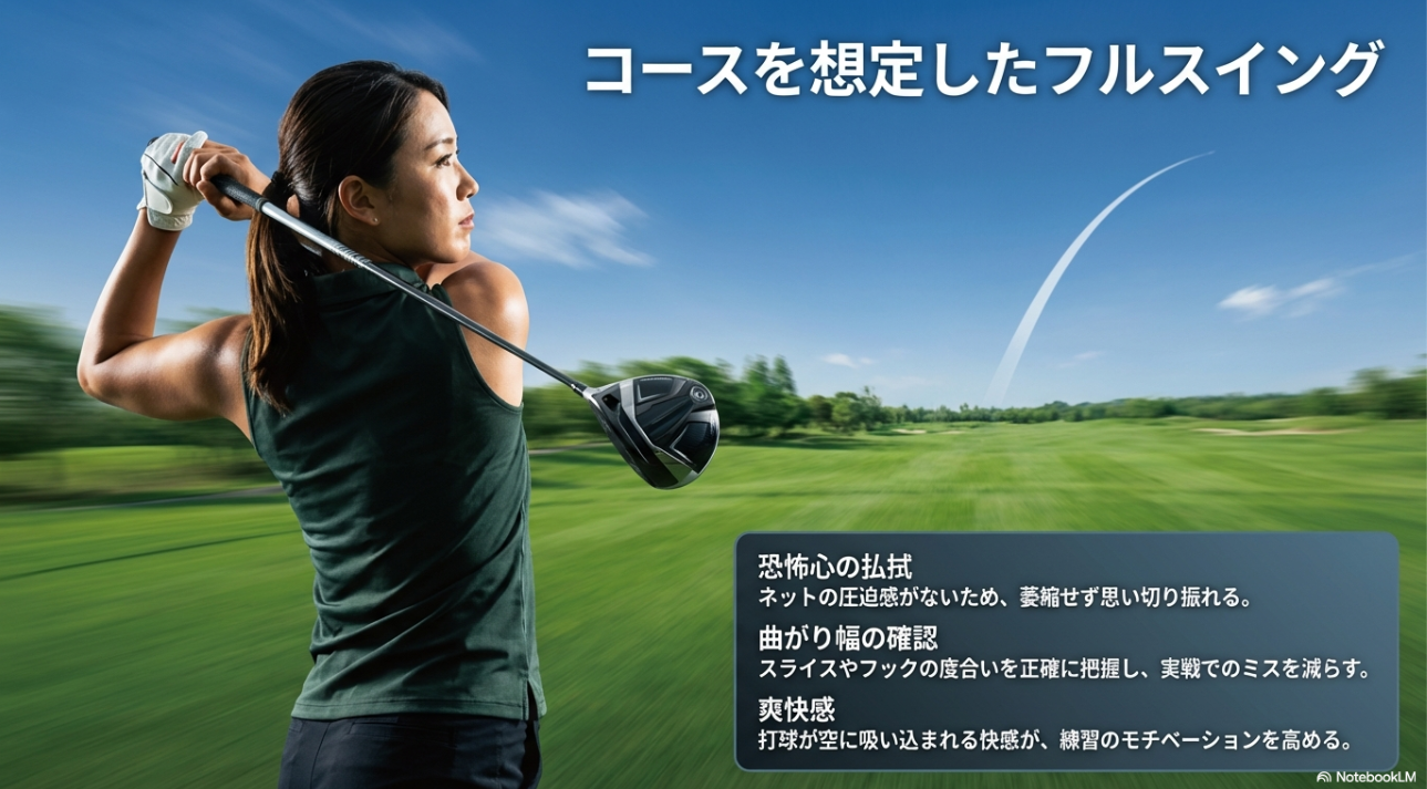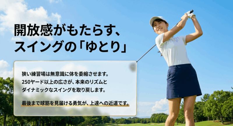 あと、意外と効くのがメンタル面。 狭いレンジって、あなたが思っているより「当てないように振る」癖がつきます。 特に天井ネットがある施設だと、知らないうちに手元が低くなって、フィニッシュが詰まりやすい。 広いレンジ、しかもフルオープンだと、“振り抜いていい”という許可が出る感じになります。 これ、コースでの振り遅れが減る人が多いです。