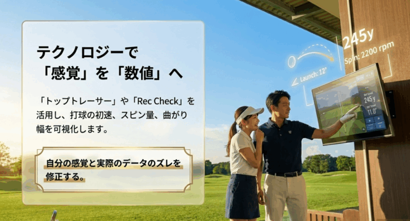 トップトレーサーの強みは、感覚のズレを修正できること。 例えば「飛んでる気がするのにキャリーが出てない」とか「曲がってない気がするのに右に出てる」とか、こういうズレって誰でもあります。 数値があると、ズレがその場で分かるので、改善が速いです。