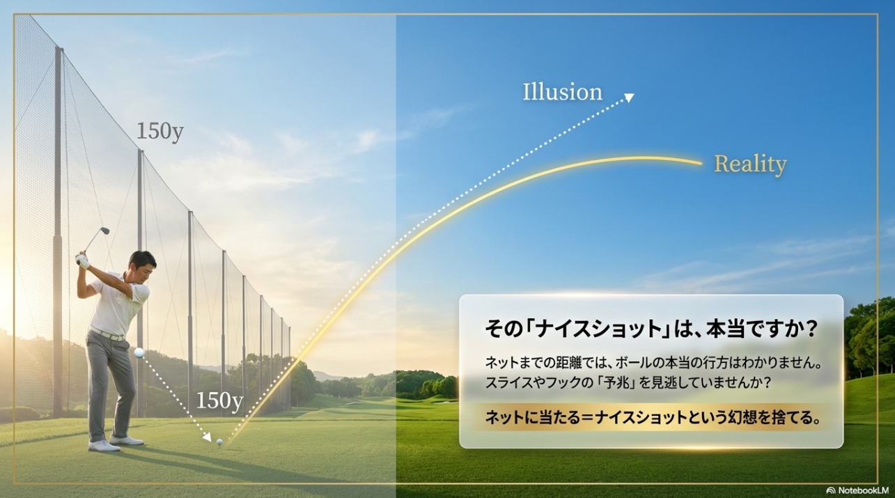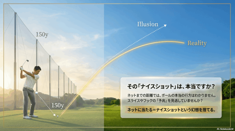 球筋作りは分かりやすいです。 フェードを打ちたいなら、打ち出し方向と曲がり幅のセットで再現性を作りますよね。 でもネットが近いと、打ち出しだけで“それっぽく見える”ので、曲がり幅の検証が甘くなります。 250ヤード以上なら、打ち出しが良くても落ち際で大きく曲がっていれば一発で分かる。 これが本当に大きいです。