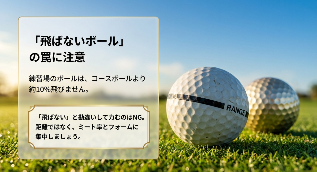 レンジボールでの飛距離は、あくまで目安です。 一般論として「レンジボールはコースボールより飛びにくい」と言われますが、どれくらい飛ばないかはボールの種類・劣化・気温・風・打席の高さで変わります。 ここを断定しちゃうと危ないので、私は「数字より傾向」を見ます。
